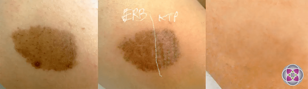 For the raised part of the nevus, the Erbium laser is best as it can precisely ablate (vaporize) the raised tissue. A CO2 laser can also be used for ablation although it is not as precise as the Erbium.