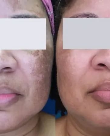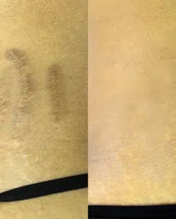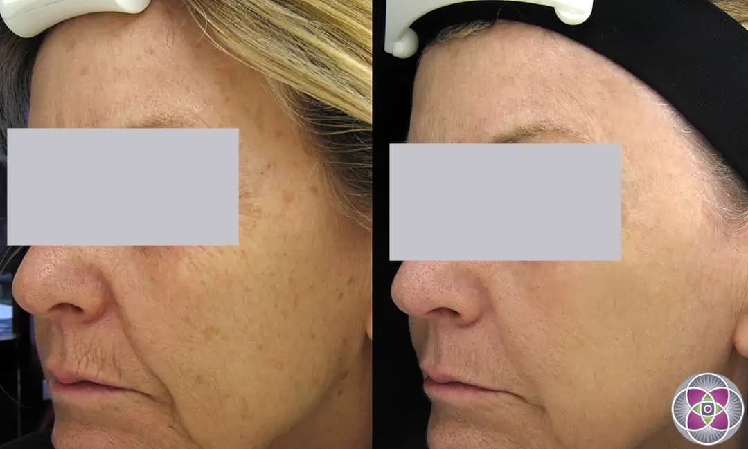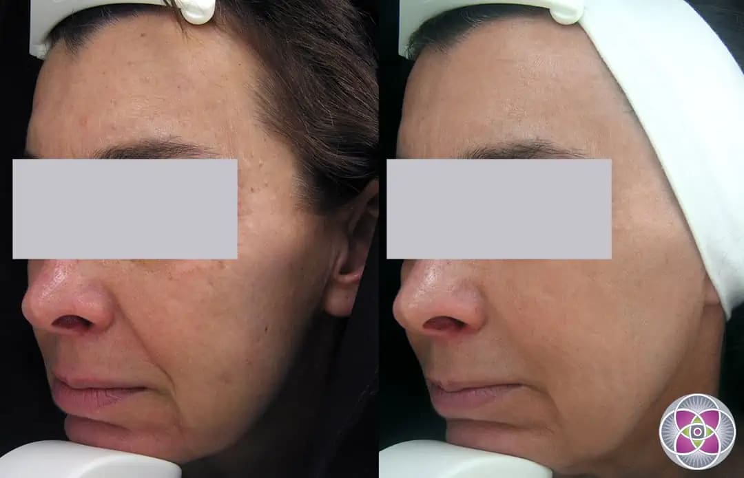 Then the overall base coloration of your face is gently stimulated (‘color blending’), causing the turn-over in baseline melanin (old melanin is replaced with new), evening out coloration.